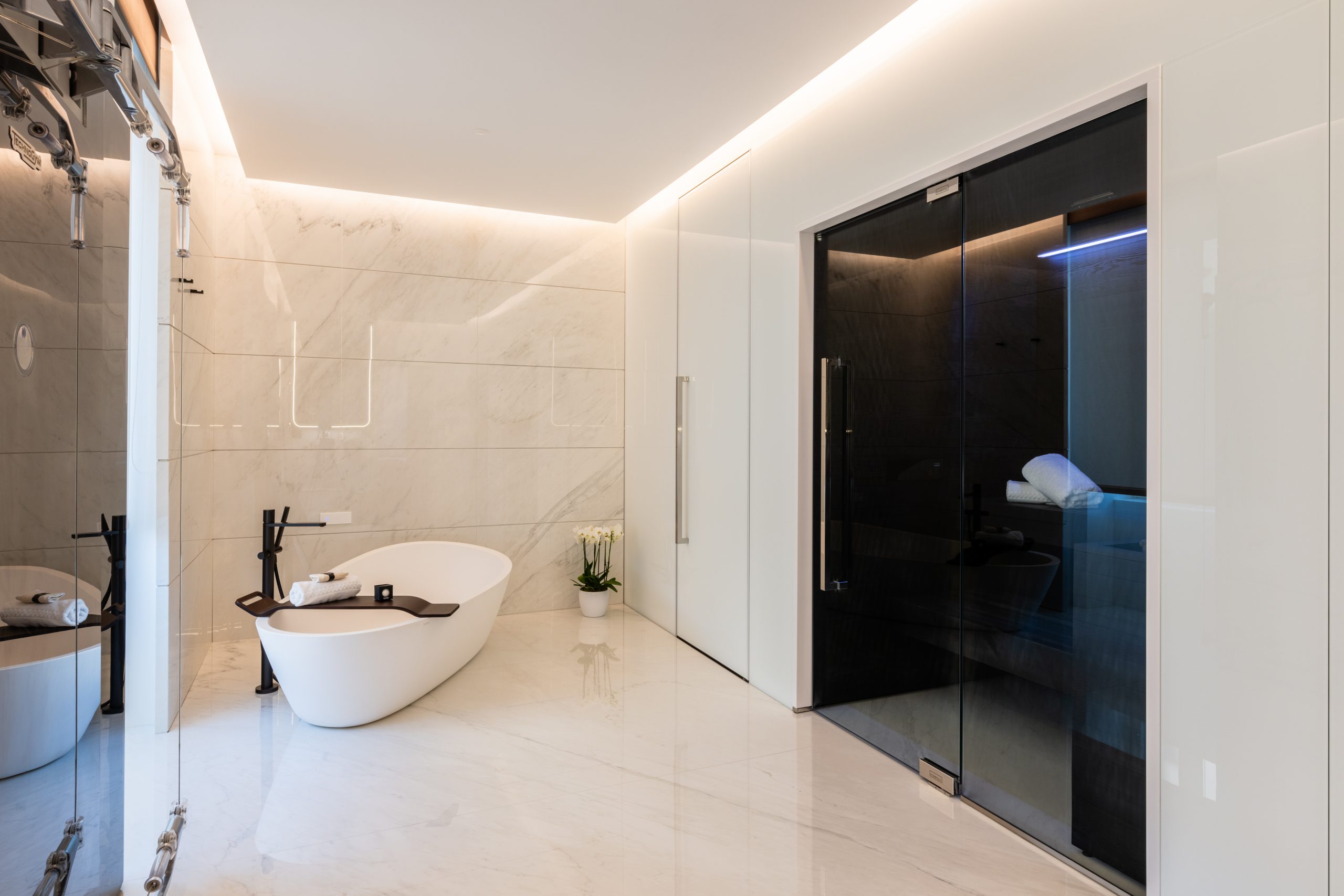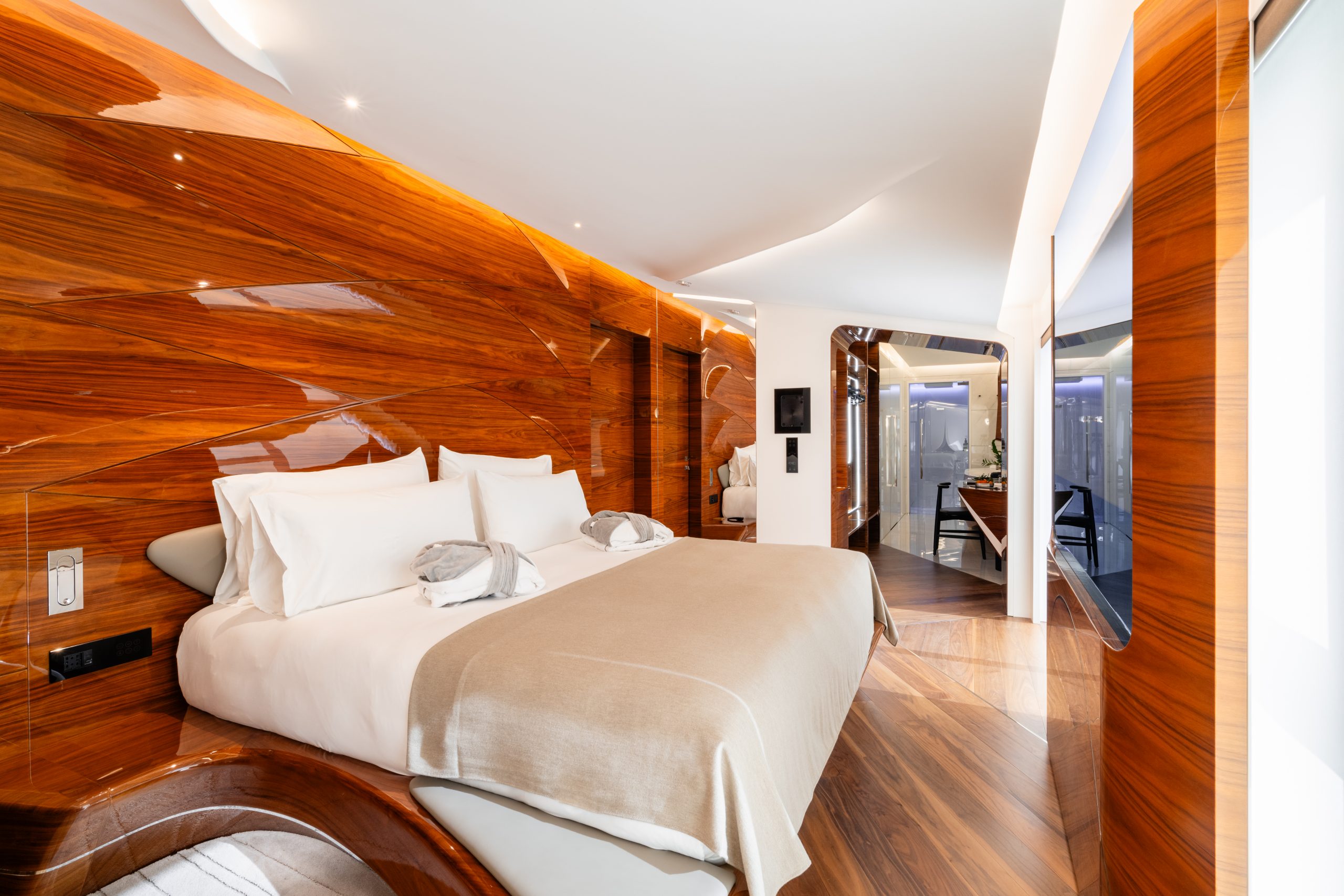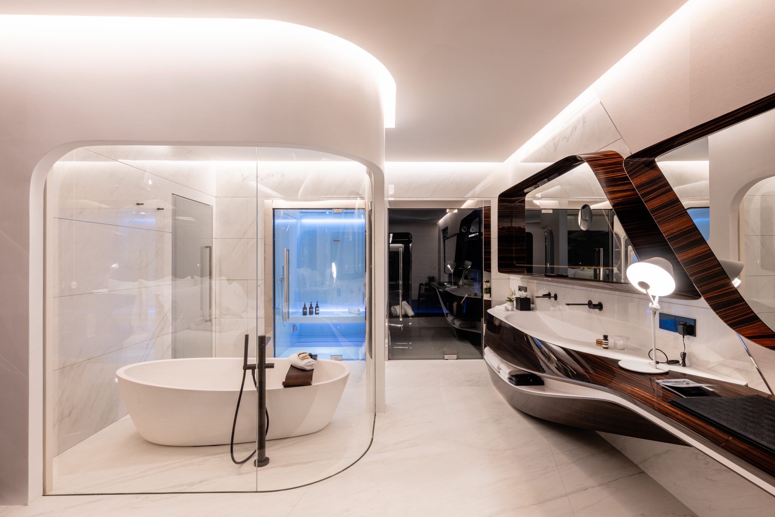 74 design-led rooms and suites, each blending Zaha Hadid’s futuristic curves with historical frescoes. Many include private terraces overlooking the courtyard, pool, or rooftops of Rome.